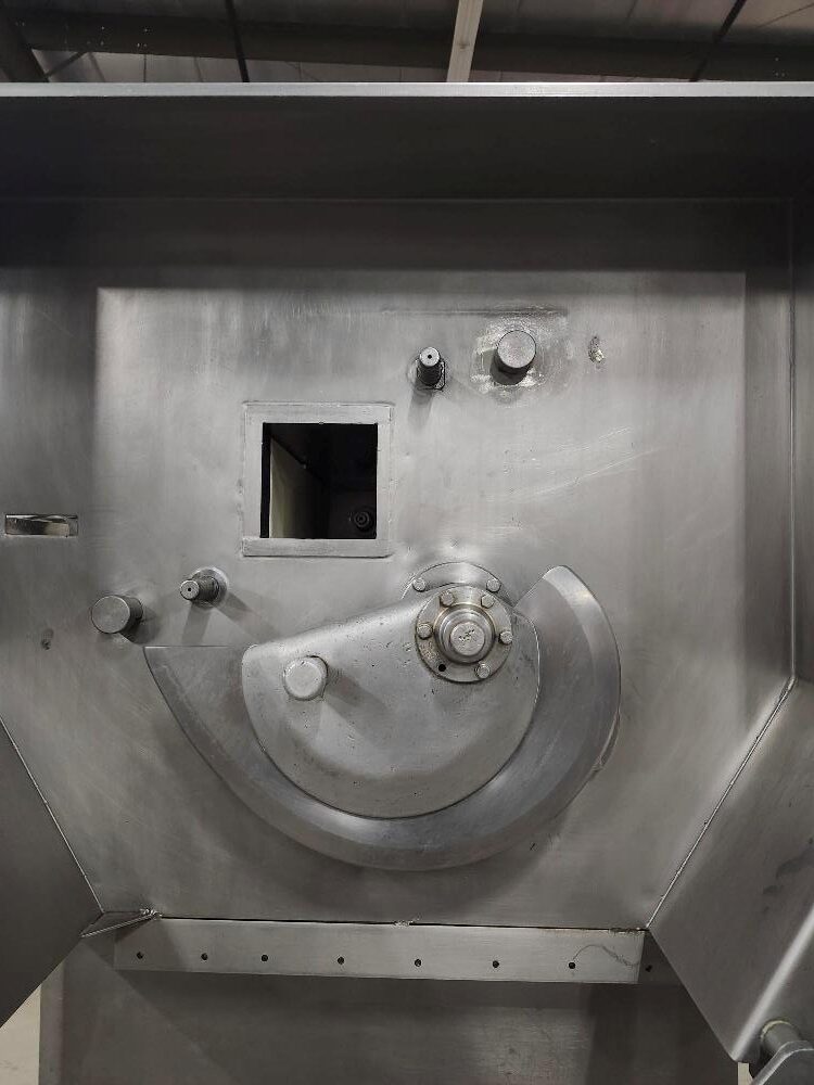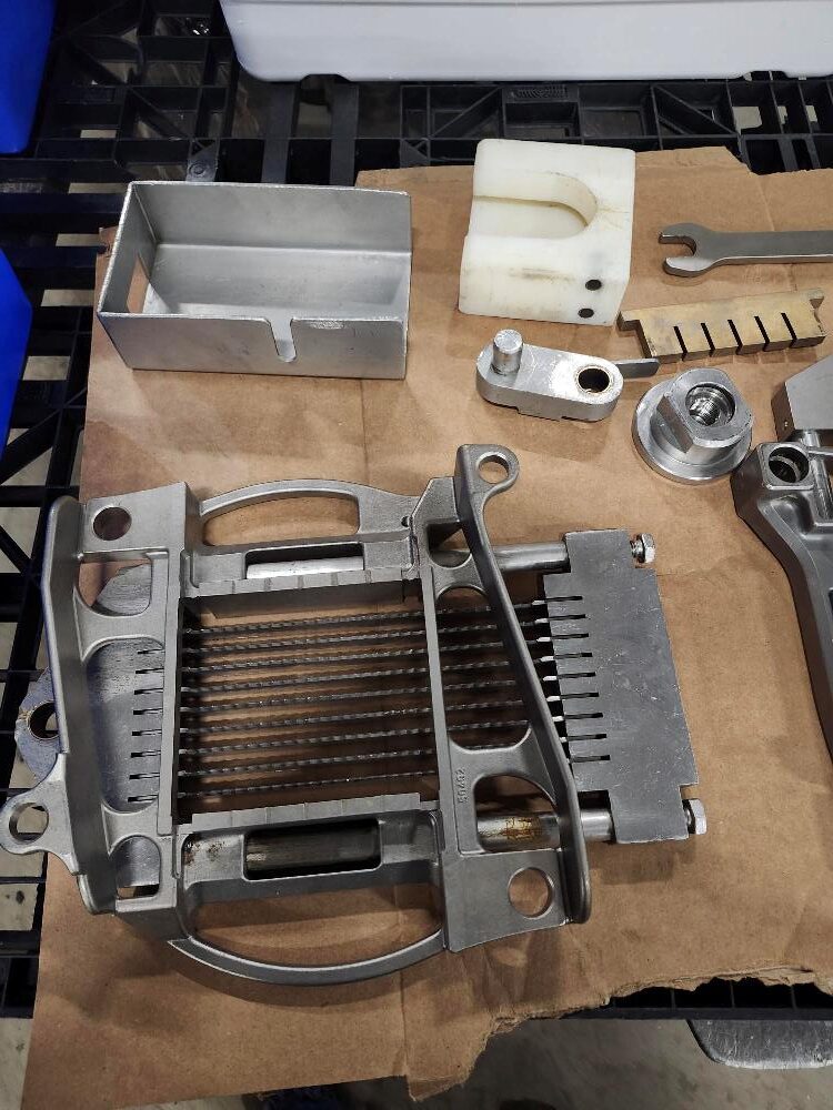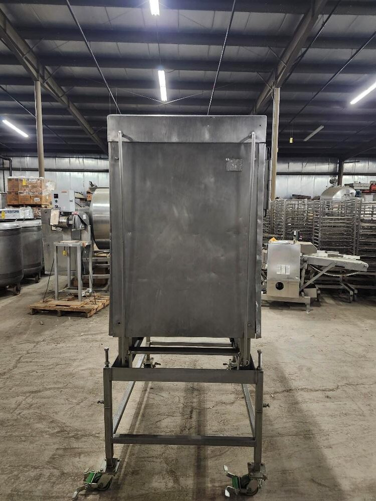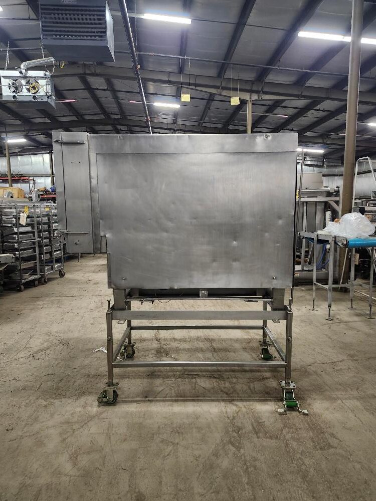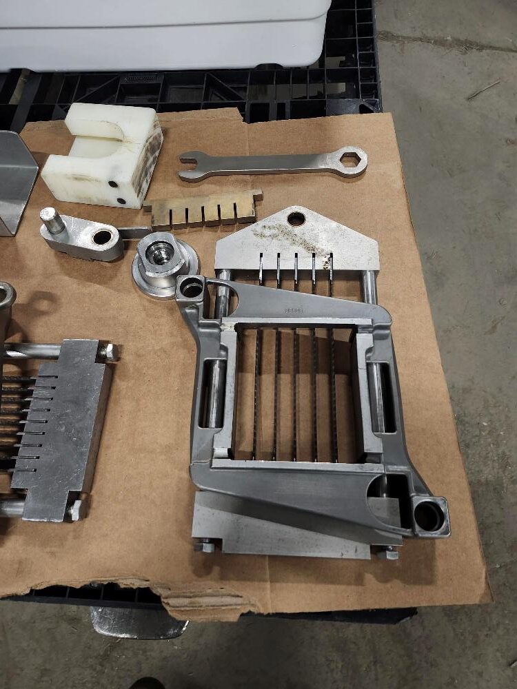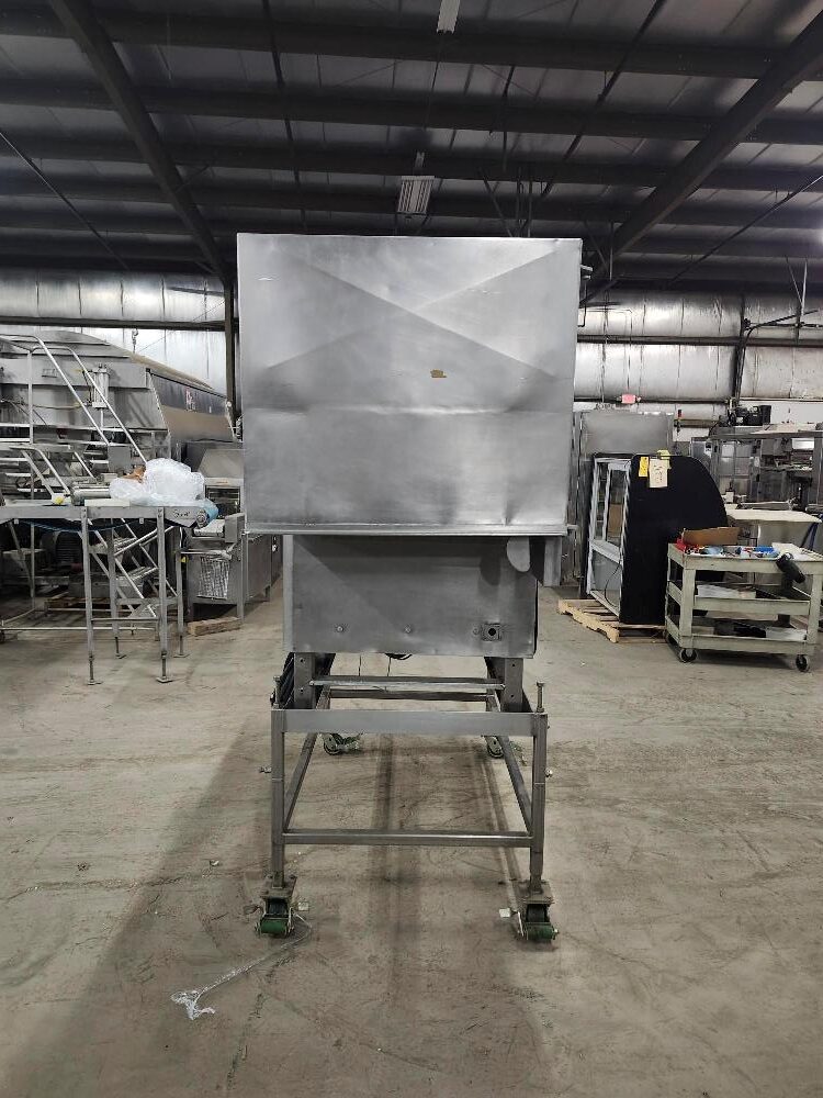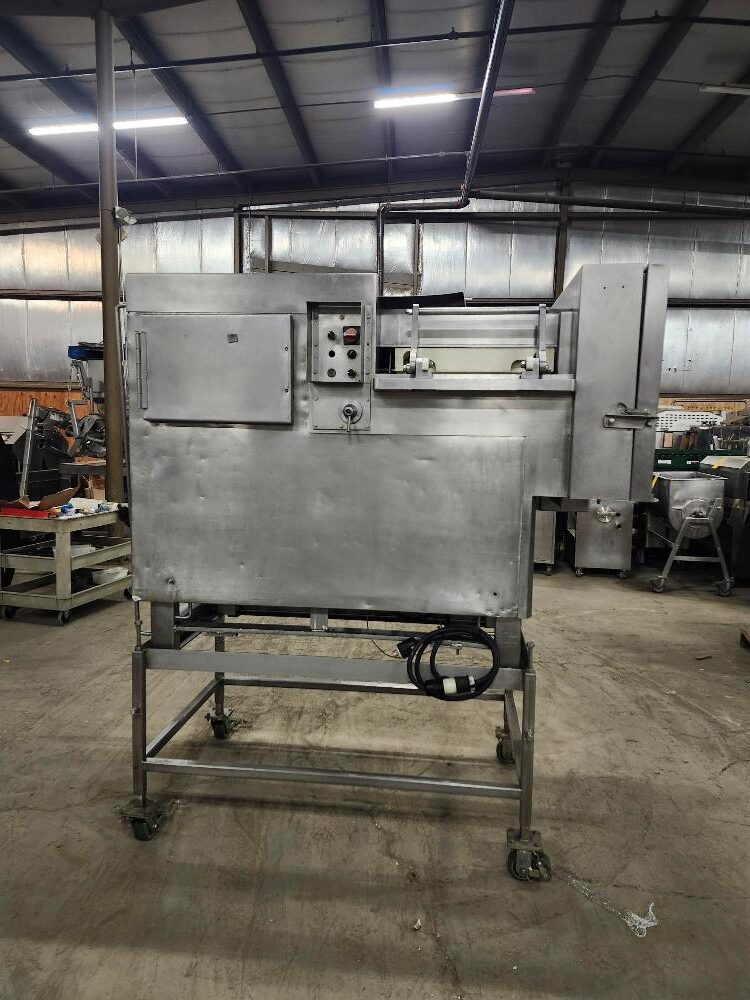 Portable Dicer, 240/480 volts, 3 phase, on stainless steel table, on wheels with cutting blades and other assorted parts, overall dimensions machine: 35" W X 68" L X 82" T.